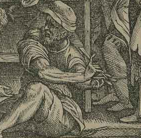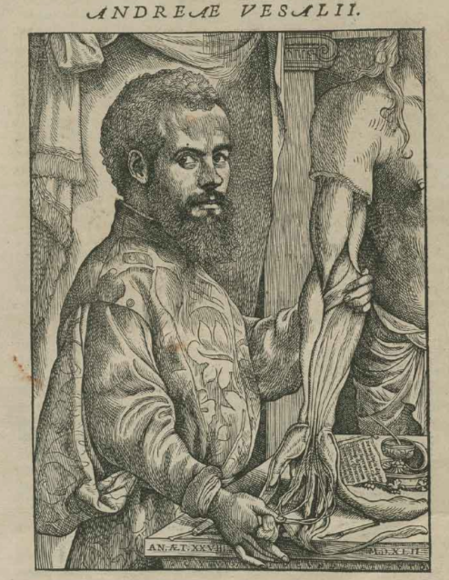 More tools appear on the title page of this book, where a man is stropping or sharpening his razor under the dissection table. The portrait of Vesalius also contains a partially hidden razor lying on the table as he holds body parts of a cadaver. In this case, the razor represents his practical knowledge and experience. His intellectual and theoretical prowess is symbolized by the inkwell and manuscript page on the table behind arm.