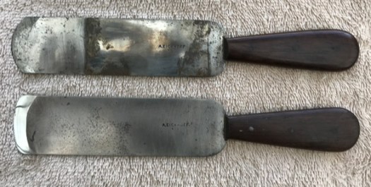 A side benefit of my regrinding and knife sharpening service is that I get to see some interesting antique knives. These August Eickhoff knives are beautifully made, have a wonderful balance, a lovely patina, and given the amount of distal taper (both on the blade and the tang) must have been forged. Eickhoff also made round knives (aka. head knives) for leatherworkers which occasionally show up for sale today. In the late 19th century, Eickhoff was located at 381 Broome St, NYC, making scissors, woodworking tools, and resharpening knives. He served on the NY Board of Education, and advertised his wares in a Teachers College Educational Monograph. It may be time to make a few reproduction Eickhoff knives.