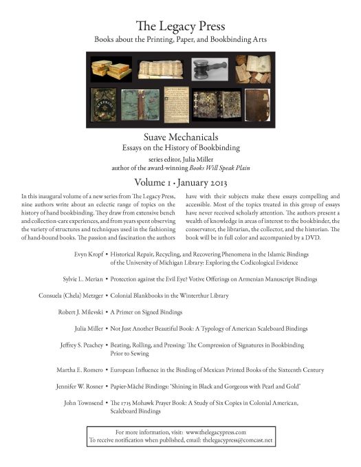 Pressing complicates all of this, but generally compresses the thickest parts of a textblock composed of handmade paper. Depending on the structure, time period, and nationality, bound books could be pressed up to six times: before sewing, when sawing in, during backing, while ploughing the edges, when applying spine linings, during edge decoration, and after pasting down the end sheets.