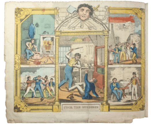 Lurid scenes of the murder, dismemberment and burning of Pass by Cook. This is also one of the earliest English images of an actual bindery. Source: https://www.antiquates.co.uk/images/ListBbPrintFinalCompressed.pdf