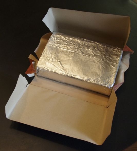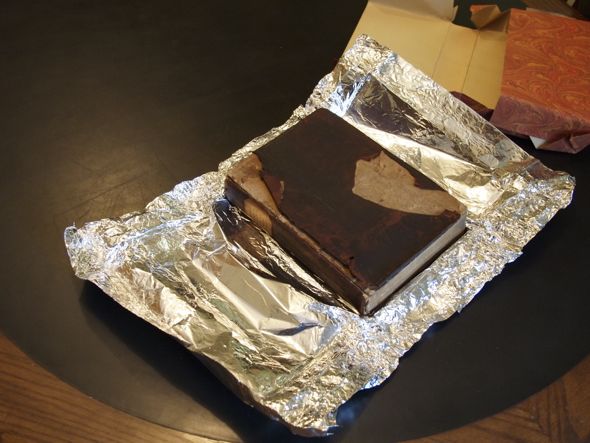 The next layer is the big surprise: aluminum foil. At the moment, I can only think of one reason for wrapping a book in foil, to prepare it for baking. I’m not sure what the Interactions between the aluminum and leather might be, but the mechanical problems are quite apparent, since the extra aluminum is rolled up and pushed onto the head and tail of the text block causing uneven stresses when the book is shelved upright. Again, it is unwieldy to unwrap.