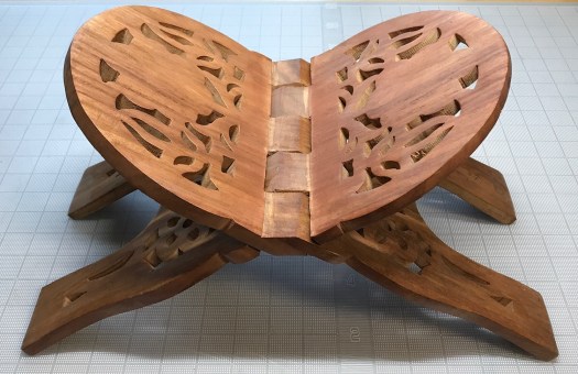 A modern rehal, which I purchased in Turkey, 2009. This is one plank that has been partially cut into two.