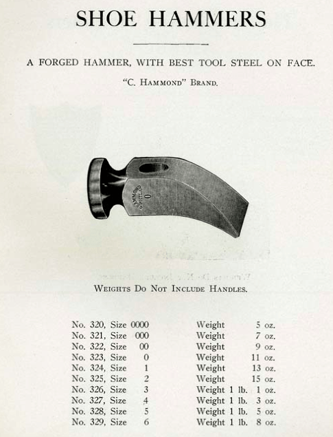 This hammer weighs 7.7 oz. with the handle, however the “0” size listed in the catalog below weights 11 oz., and the “000” 7 oz., (without the handle) which may contradict my theory, that very generally speaking, hand tools tend to get smaller over time. “Dinkification” is the technical term for this evolution.
