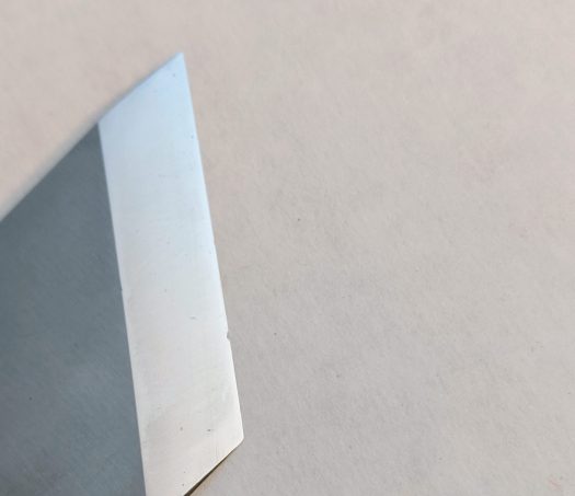 I’ve noticed the similarities between German style chef’s and bookbinder’s knifes for a while. The primary one is the taper of the blade from the back to the cutting edge, parallel to the length of the knife. It doesn’t make sense functionally to make a paring knife like this, so German binders wrap the handle with leather, cord or thread to hold it more comfortably. The thin metal around the cutting edge is quick to resharpen, though. There are also the three cutlery rivets on the handles; these are technically called scales on a full tang knife.
