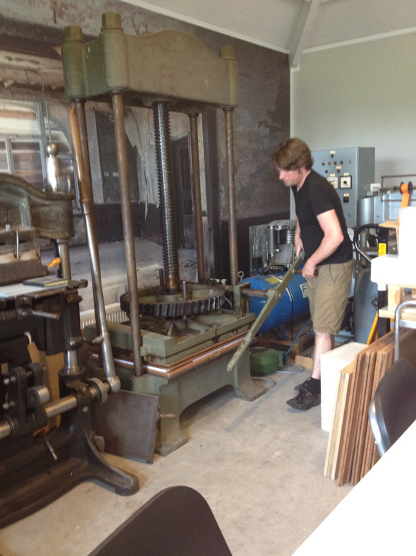 Wytze has the most massive operational standing press I’ve ever seen. He mentioned that it is the largest in Holland. He is operating the worm drive. Once the center screw is tightened as much as possible, to generate even more pressure, the drive can crank the main press screw another turn or so. The drive can be easily disengaged to quickly raise or lower the press. As a demonstration, he pressed some of our textblock paper so hard it sunk into the MDF pressing boards, creating a clamshell. It had little to do with the class, but was too impressive not to mention.