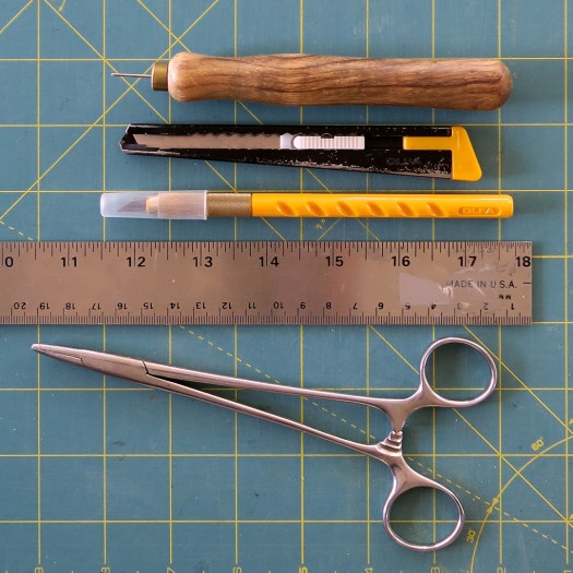 In my practice I create artist’s books and content-sensitive altered book works. I rarely use the sewn codex as a format, so I did not include an awl —I have three lovely ones in different sizes made for me by my partner David— or a needle. My two most used tools in any project are a home-made scoring/scribing tool and an Olfa snap-off-blade knife. I also use a scalpel when cutting, especially curves. The eighteen inch steel rule is absolutely essential. The surgical forceps would not have made my list under normal circumstances, but I discovered that they were the only tool I own that would enable me to assemble my most recent artist’s book.