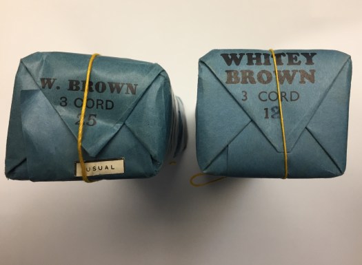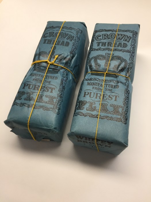 These packages contain hanks of thread, and all weight about a pound. I think the package on the left is 25/3, and on the right 12/3. So if my calculations are correct, the 12/3 should contain 1200 yards of thread, assuming a 12/1 would contain 12 – 300 yard skeins = 3600 yards. Enough thread for a lot of books in any case!