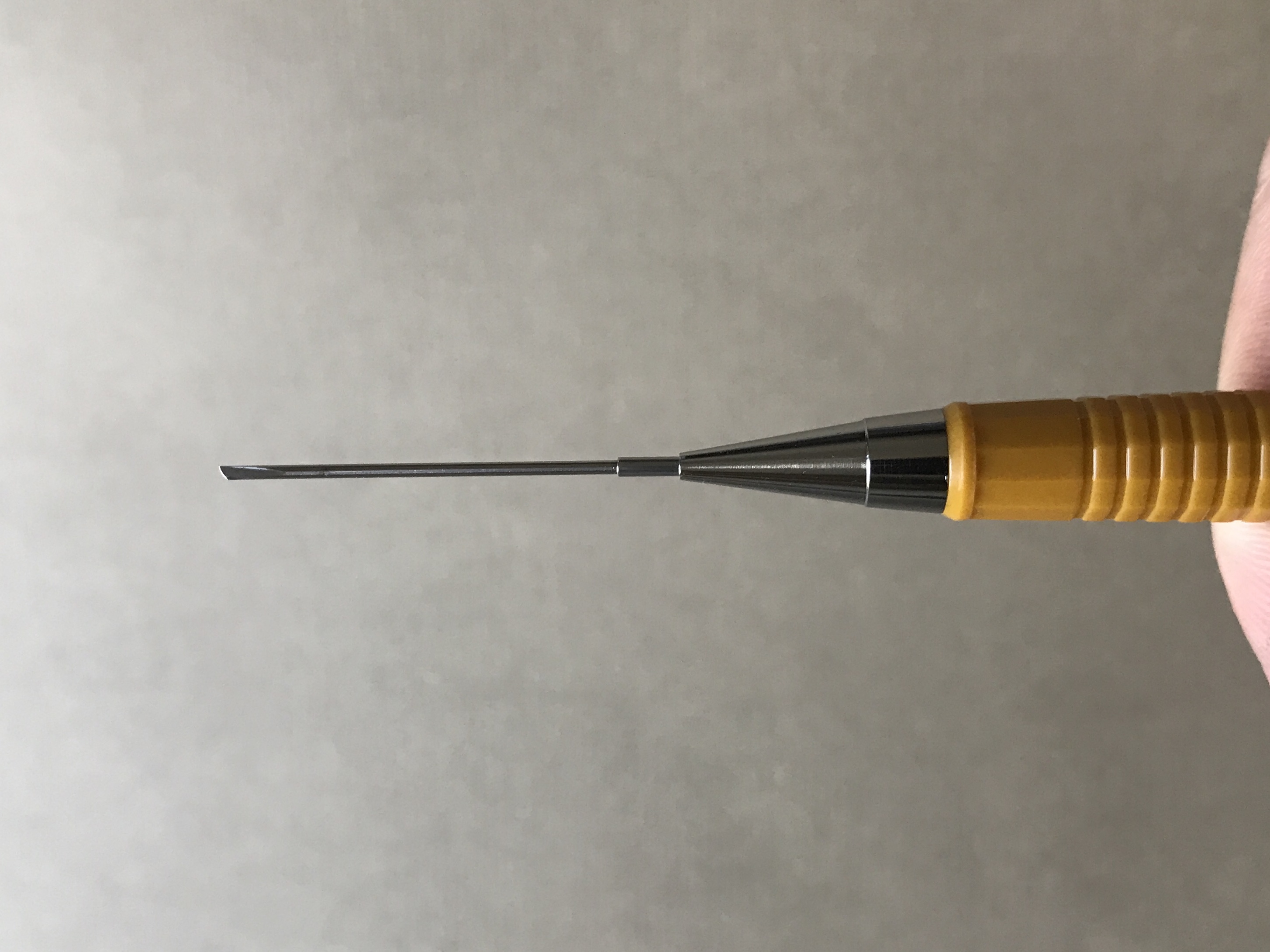 Most lifting tools are quite thin. Usually, this is great. But the thinness of the lifter results in a lack of control at the tip. In order to counteract this, I’ve come up with a very long wedge shape lifter that provides an an incredible amount of control for lifting, twisting, sliding, and prying. The straight cutting edge and rounded corners also aids precision manipulation.