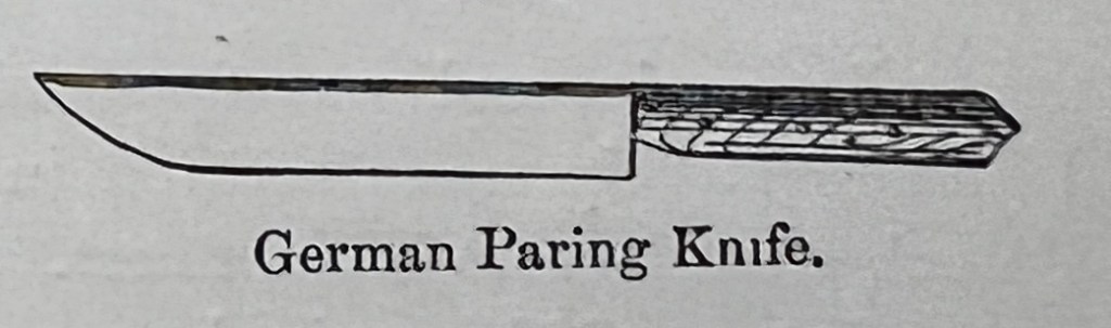 The paring knife in Zaehnsdorf’s manual has a similar shape to the medieval knife and moddern chef’s knifes, as do the ones in Peter’s 1928 Braunwarth & Luthke catalog, below. Most seem to have a taper towards the edge of the blade on the left, as indicated by the thicker black line indicating the back of the blade.