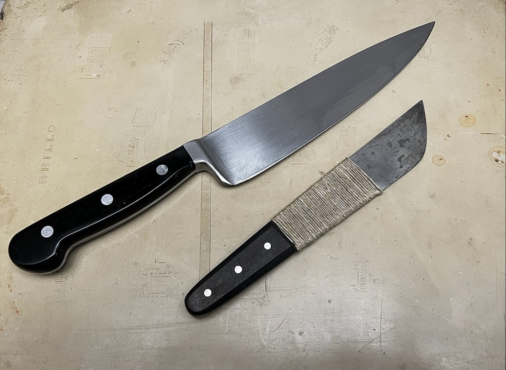 Top: My Henckel 8 inch Chef’s knife. Bottom: Modern German style bookbinder’s leather paring knife.