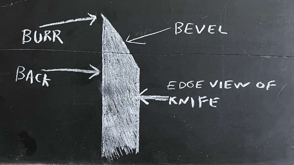 I’ve noticed the similarities between German style chef’s and bookbinder’s knifes for a while. The primary one is the taper of the blade from the back to the cutting edge, parallel to the length of the knife. It doesn’t make sense functionally to make a paring knife like this, so German binders wrap the handle with leather, cord or thread to hold it more comfortably. The thin metal around the cutting edge is quick to resharpen, though. There are also the three cutlery rivets on the handles; these are technically called scales on a full tang knife.