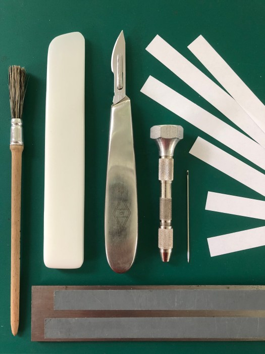 1. Folder. Bone for a sharp crease on paper, Teflon for surfaces that might become burnished. A Delrin Folder combines the best properties of both.