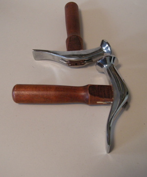This French style cobblers hammer is interesting for two reasons- the very short handle, which actually gives a lot of control and I did observe an iterate street cobbler using an identical one, and the unusual method of head attachment. Earlier French cobblers hammers often has straps that extended down the handle. Salamon, in his Dictionary of Leatherworking tools pictures one. In this case, there is not a wedge that holds the handle in the eye, but a hole is drilled through the wood and the thick wire extending up through the sides of the eye are bent over to peen the metal to the wood. I haven’t been extremly rough with it, but it seems a fairly secure method. I purchased all of these in Istabul, Turkey in 2008.
