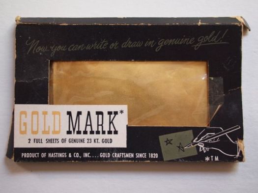 The Hastings & Co. Goldmark foil is likely from before the mid-1950’s, when Hastings was bought by Kurz. The advertising on the back of the box tends to emphasize its use for greeting cards and on wrapping paper. “Now—you can have the luxury of writing or drawing in gold—easy to do and so much fun.” Indeed, it is fun to use and so luxurious to write in genuine gold. The advertising also mentions that the marks will not smudge on paper, but a coat of nail polish should be used to seal it on wood, metal or glass. Kurz still manufactures hot stamping foils, many of which I use and like quite a bit. Of particular interest to bookbinding historians is that in 1931 Kurz invented a vapor deposit stamping foil with real gold, used for hot stamping. Middleton, in A History of English Craft Bookbinding Technique dates the invention of real gold foil in England to 1933. (p. 186) It is unknown when the earliest pressure sensitive foil was developed.