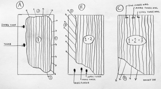 B. Move your hand and place your ring, middle and index finger on the bottom of the sheet, in the area where there is not adhesive, then brush the top left side. This can also help keep the sheet from curling into into itself. On small sheets, 1, 2, and 3 can be done at the same time. All of this depends on a balancing how fast you are working, how reactive your paper is, and how much moisture is in your adhesive.