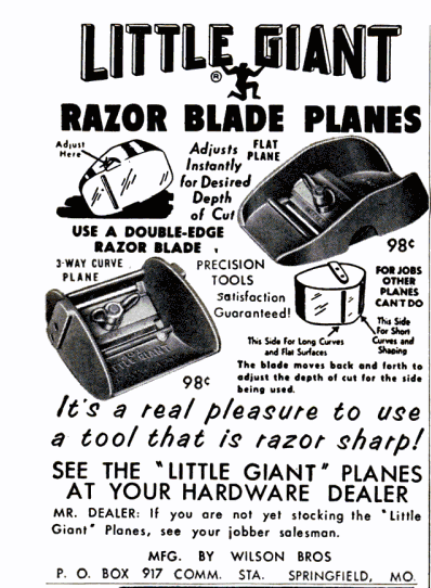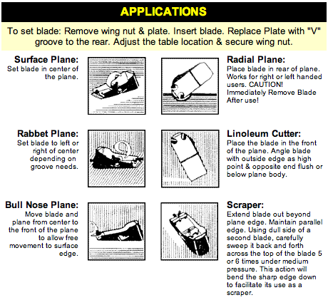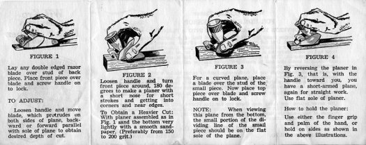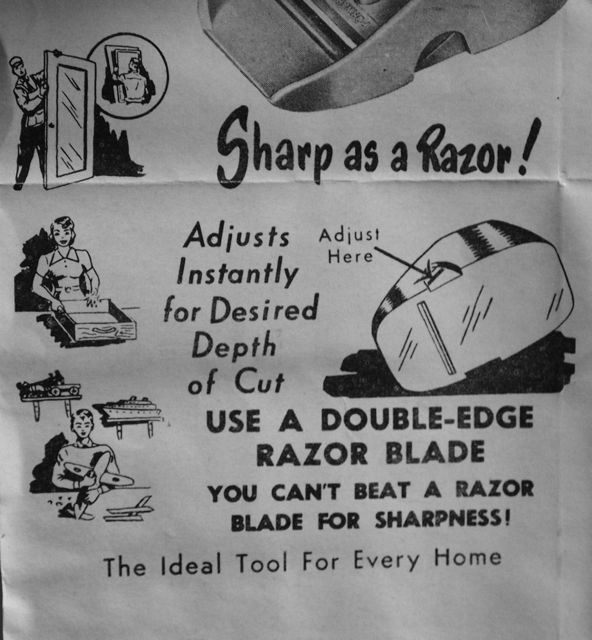 The informational sheet included with Little Giant planes shows three vignettes of the plane in use: a man trimming a door, a woman shaving down a drawer, and a boy making a model airplane. This is a tool not only for the man of the house, but the entire family. Note that it is advertised as being “sharp as a razor”. Yes,well, it is a razor.