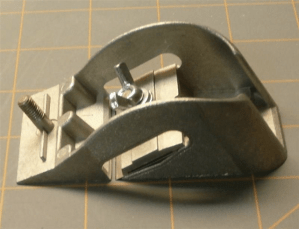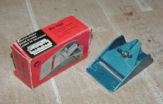 Eric Alstrom adds that these are made of plastic, and “I never put it in the same class as the Little Giant. Both for how it works and how it is made. I’ve used it now and again for touch up, but the angle of the blade isn’t low enough to pare very effectively. Mine came with a half dozen blades or so and I’ve only marked about half of them as used, so I haven’t used it that much. You mention the “proprietary double edge blade” which is true they are proprietary, but my blades are only single edge. The adjustment screws push against a flat edge. I got mine about 20 years ago, so maybe they have changed since then.”