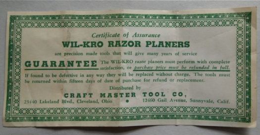 The plane also came with this Certificate of Assurance. It certifies that the Wil-Kro is percision made and will give many years of service. It then guarantees this performance for exactly fifteen days from the date of purchase. The overall size of this cerificate (152 x 71 mm) is almost exactly the same as a dollar bill (157 x 66mm) and the green ink and boarder decoration also seem to visually imply paper currency. Most Wil-Kro boxes list “Craft Master Tool Co.” as the manufacturer and the contact for the warranty. One box I have, however, does not include a warranty and lists “Winston Sales Co.” as the manufacturer on the outside. Otherwise the boxes are identical.