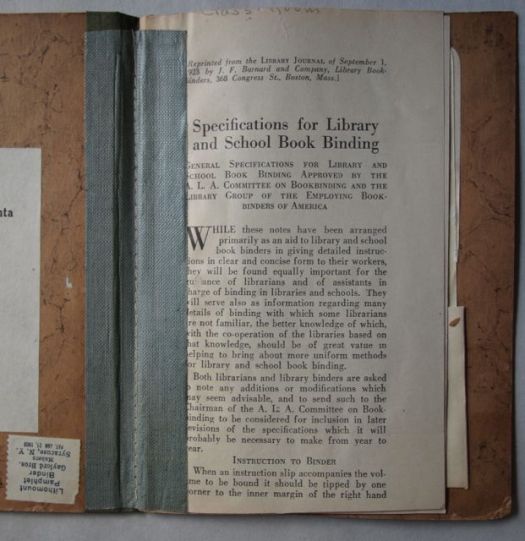 For the next version of General Specifications for Library and School Book Binding I propose mentioning that when binding pamphlets, do not to cover the text with Gaylord pamphlet binder tape. If it is necessary to use an adhesive pamphlet binder, I also feel it might be a good idea to recommend using one that is the proper size, to avoid excessive trimming to the margins. And if the margins must be trimmed, I suggest including a bit of practical advice in how to cut a straight line with a pair of scissors. I am more than willing to discuss these matters in greater depth, at your convenience, and apologize for this very belated response, but books last a very long time even if mistreated, so I trust this information may still be pertinant.
