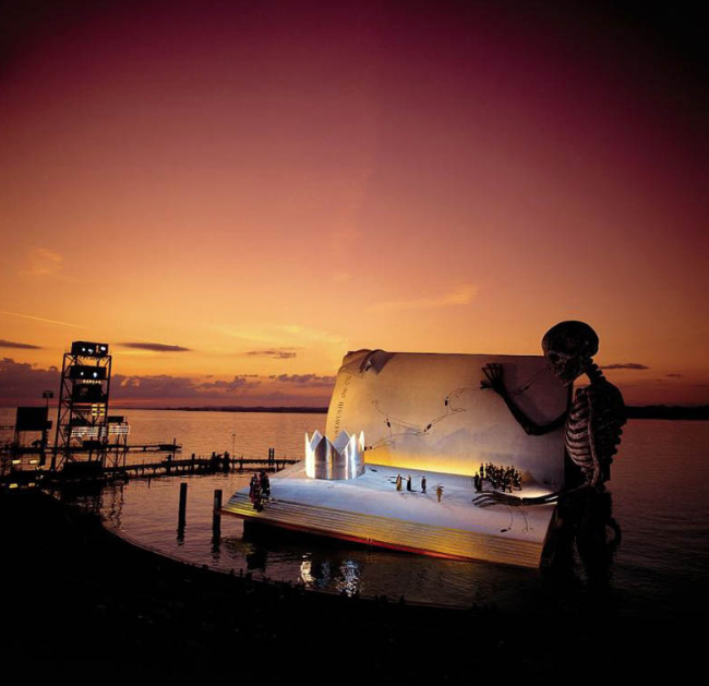 Exhibit two is the The Opera on the Lake of Bregenz. Yes, those are lilliputian actors standing on the open book. The 1999-2000 performance of Verdi’s Masked Ball had the entire stage made up of a book, held open by Death. Thanks to John Townsend for this reference.