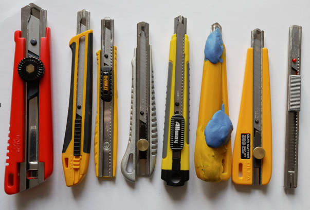 The third most commonly mentioned tool is a relative baby. Yoshino Okada invented the Olfa snap-off blade knife in 1956. He lived through the occupation of Japan by the United States in WW2, and later remembered American GIs giving him chocolate bars which could be broken into pieces. Working for a printing company, he grew tired of not having a sharp knife always at hand. Inspiration struck when he was looking at the sharp shards of a broken glass, the memory of the chocolate resurfaced, and the concept for a snap-off blade was born. At least according to official company lore.