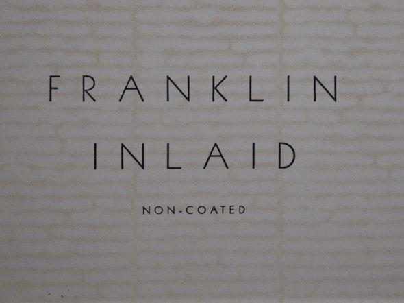 Handmade paper generally has chain and laid lines. These were originally aspects formed by the making of paper, though are artificially replicated in machine made papers. What is called “fake” chain and laid lines are, in fact, thinner deposits of pulp in the paper, often made by a dandy roll. The chain and laid lines in the Franklin Inlaid paper are beyond fake, however. They are printed on the surface of the paper. The chain and laid lines in this paper were available in four colors.