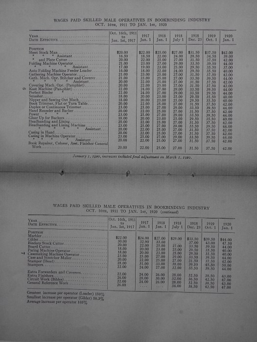 It is often claimed that the most skilled, and highest paid position in a bookbindery was the finisher. However, in 1920, the J.F. Tapley Co. paid the head stamper $50 a week, while an extra finisher earned a bit less, $47. Even the casing-in machine operator earned $2 more than the hand casing-in position, at $44 a week. Wages varied between $37 and $50 for skilled male work. At least for this company, machine operation was apparently valued more highly than hand work, likely because it was more profitable. All the workers are referred to as “operatives”, whether engaged in machine or hand work.