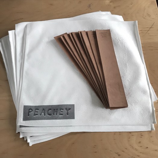 Peachey branded microfiber towel. $5.00. My first foray into merch! A stylish and practical way to show your support for Peachey Tools. This is a heavy duty, professional grade microfiber towel: 16 x 16 inches, 300+ gsm, 4-thread edge stitching, .1-.2 denier microfibers, 80% Polyester/ 20% Polyamide blend. Perfect for cleaning your knife and microfinishing film during sharpening, the floor, your cutting mat, and even removing excess grease from your nose. The dye sublimation printed logo seems durable on my sample, but it is not possible to have a super dense image on the three dimensional microfiber surface. The fibers fluff up over time: the towel in the image above was washed seven times. The great thing about microfibers is that they trap everything. The terrible thing about microfibers is that they trap everything, so the towel will turn grey over time, likely obscuring the logo anyway. But you will still know it is there! What could be a nicer gift for all your staff members, as well as a gentle reminder to keep things clean? They should be in stock December 11 at Peachey Tools.