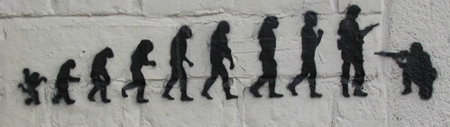 I noticed the first example last year in Oxford, England. The monkey on the far left looks positively joyful, perhaps existing in a pre-technological garden of eden. The transition between the man making a fist and the one holding the gun is compelling, and it is with the appearence of the gun that the man stops walking–in the next picture he reverts to kneeling. The advent of tools, in this case a gun, threatens the entirety of past evolution and seems to put a halt to human progress. I often think of fire as the original technology, but warfare might be earlier. Kubrick had an extended scene about monkeys discovering a bone cub which they use to kill each other in the movie 2001. On the other hand, several of the technologies that are used in Book Preservation (such as microfilming) were originally developed by the military industrial complex.