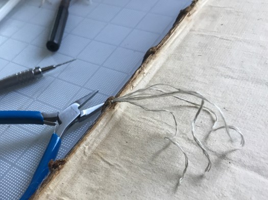 In this variant of sewing support extensions that I came up with, new thread is carefully looped in signatures and under or through existing cords, without having to lift the leather on the spine. Unlike joint tacketing, this method does not restrict the movement of the book spine at the shoulder.