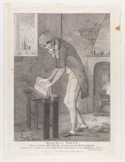 I suppose most bookbinders are familiar with this depiction of Roger Payne. I first encountered it as Plate 59 in Edith Diehl’s Bookbinding: Its Background and Technique, which was the second book on bookbinding I read in 1988. The scene is often referred to as a “dingy garret”, though to be fair, many slightly later depictions of binderies, ca. 1830’s, are in a similar state, with cracked plaster, dirty looking walls, etc….