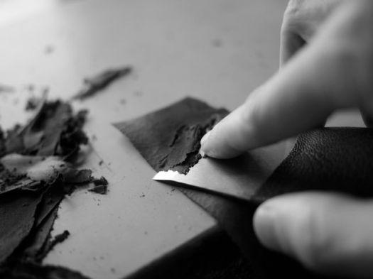 In the image above, notice that my thumb and middle finger support the blade at the proper angle to the paring surface and pushes the knife forward. Notice that only one side of the blade is used and relatively small strips of leather removed at each pass. Commonly three or four strips are pared off until the desired turn-in width and thickness is reached. It is very difficult to control cuts with the entire width of the blade unless you are using more of a smoothing cut pictured below, which is almost more of a scraping action — a bit like what a spokeshave does, except that your hands jig the blade. For the spine area and general scraping, however, a rounded blade is still preferable, since only a small part of the blade is actually cutting at any one time. The relatively wide blade makes it easy to reduce the thickness of a corner with one sweeping slice, which helps make a neat corner.