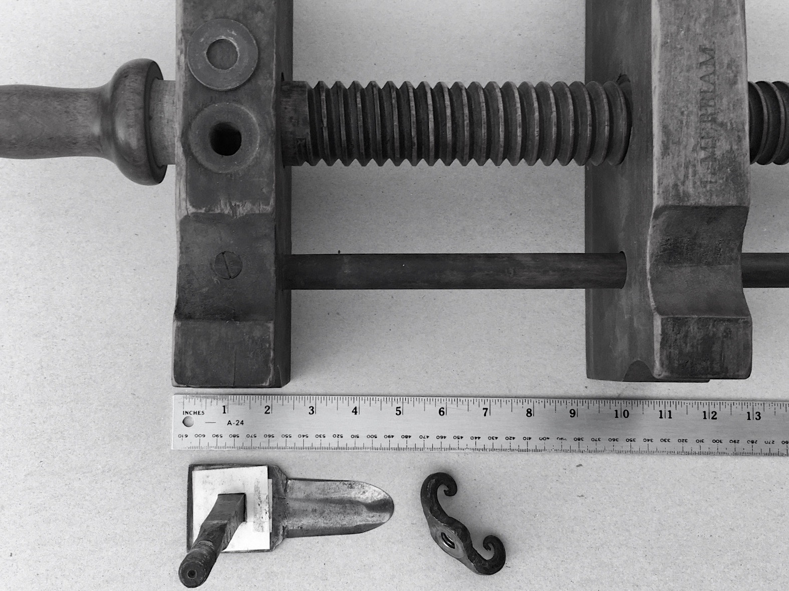 Dating small bookbinding tools is rarely possible because there are few pictures of them before the 1880s, and the early pictures were reused in catalogues and manuals for many decades to avoid the cost of engraving new ones. But these newly acquired sewing keys might be datable, I thought when I saw them, because they were marked “J. Wright” on two of the six broad flats, “Noel Street” on another. English language. No city, that probably meant London, “the flower of cities all,” the default, the center of gravity. Ownership mark or maker’s mark? We’ll see. To find out when and who J. Wright was, meant checking the London city directories (“Kelly’s Post Office London Directory”) year by year through the 19th century to see if a J. Wright would turn up on Noel Street, if there was a Noel Street. The slog began. He was there, in Soho, in the 1840s and early 1850s all right, down through 1854. Then he was out of the directories for a year. Was this a terminus ad quem, an upper bound, a before-which-limit to his dates of activity? In 1856 there was no John, but an address for his estate and for his widow as executor. Definitely a limit! And then…
