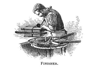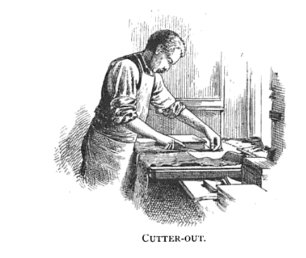I wonder if he is cutting on a tin, or cutting board. The knife has a handle. In shoemaking, the cutter-out (called the “clicker”) is one of the most skilled and highly paid positions, since they have to decide how to make best use of flaws in the skin. He does have primo bench position, right in front of a window.