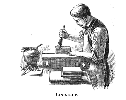 Zaehnsdorf’s A Short History of Bookbinding, originally produced as promotional material, contains some nice images of his premises and details of several steps in binding. Even in these low-res google scans, interesting details can be observed: the headbander using an upside-down plough, the massive finishing press with wood top (replaceable, to protect the press from glue?) used for spine lining and finishing, the sewer working inside the frame, etc….
