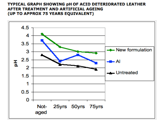 The research showed that the aluminium alkoxide has an acid-buffering capacity and collagen stabilising property, as it increased the TS and pH of new mimosa-tanned leather, artificially-aged mimosa-tanned leather and acid-deteriorated historic leather. Retanning vegetable-tanned leather with aluminium is known to increase the thermal stability of vegetable-tanned leather. In this study, it appears that the Organic Stabiliser in the formulation reacts with alkoxide to enhance formation of stabilising matrix. The formulation may be creating a similar effect to retanning vegetable-tanned leather with aluminium.