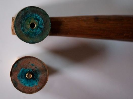 I made this small brass hammer a couple of years ago. One face is brass, and the other a removable piece of horse butt leather. When recently unscrewing the face, I was surprised to find verdigris forming. But it makes sense: the acedic acid offgassing from the PVAc (Jade 403) must have reacted with the copper content in the brass. It you want to make verdigris, this might be a good thing: if you are working on a book with brass or bronze hardware, PVAc should be used with caution.