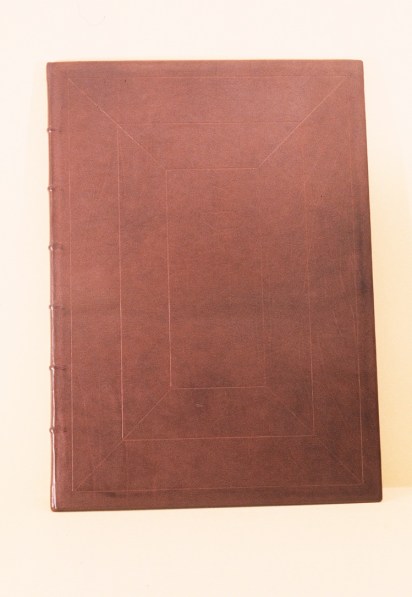 New endsheets, consisting of a double folio of handmade paper and a linen hinge were constructed and the text was resewn with linen thread on 6 linen cords following the original sewing holes. Single core headbands were sewn with acrylic dyed linen thread. Boards were made up and laced on and the book was covered in a dark brown calfskin, in a sympathetic style to the age of the text. Given the size of the book, no leather was available to match the spine of the animal with the spine of the book, the leather had to run perpendicular to the spine of the book. Even with the spine of the animal running horizontal, only two skins were large enough from the stock of calf at TALAS. Given the large size of the skin and its orientation, there was considerable expansion along the height of the volume, which had to be taken into account when paring the leather. The 53 cm of leather expanded almost 5%, or 2.5 cm. A separate pastedown of handmade paper was added and original bookplates replaced. A blind triple panel design was tooled on the front and back, and a double wall drop-spine box with three recessed gold stamped leather labels was constructed.