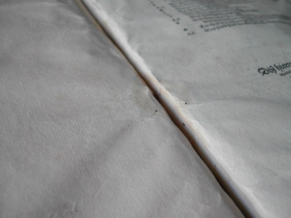 Most of the leaves were joined approx. 2 cm at the spine, to make folios, so the book could be sewn in a normal manner. The stiffness of the glue and double layers of paper, combined with the crease in the middle of the page, which is acting like an “I” beam, is causing the pages to drape poorly and the page to crease in the middle, causing tears on four of the first leaves each time the leaf is turned. With careless handling, each time the page was turned, the tendency to crease was reinforced.