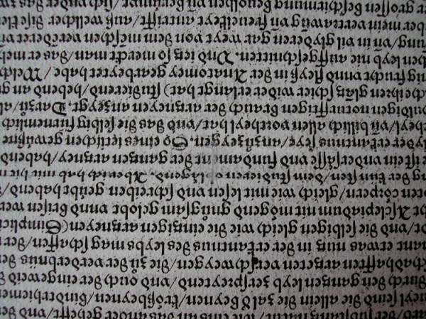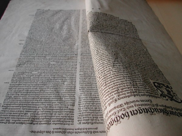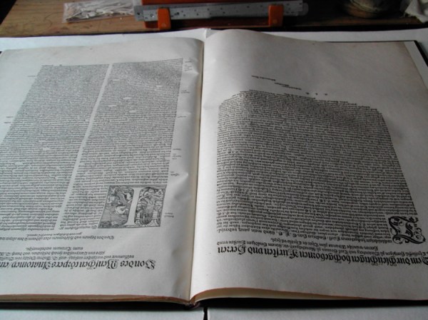 A crease like this has been noted in other copies of this book, and rare book librarian lore attributes it to the fact that this text was used by students, and they would fold it in half to carry it to and from school. In this case, however, the crease extended through the text area, but not in the margins outside it, which would suggest it was not folding that created it, but the combination of the paper being cross grain and the extreme pressure needed to print such a large surface area. The large size of these leaves also contributed to this. On a few of the leaves the crease was so severe that a line of text was obscured. The puckered area in the middle is the result of this horizontal page fold bending. Heavy pressing during the rebinding might have compressed these folds even further, expelling air and making them impossible to open without humidification.
