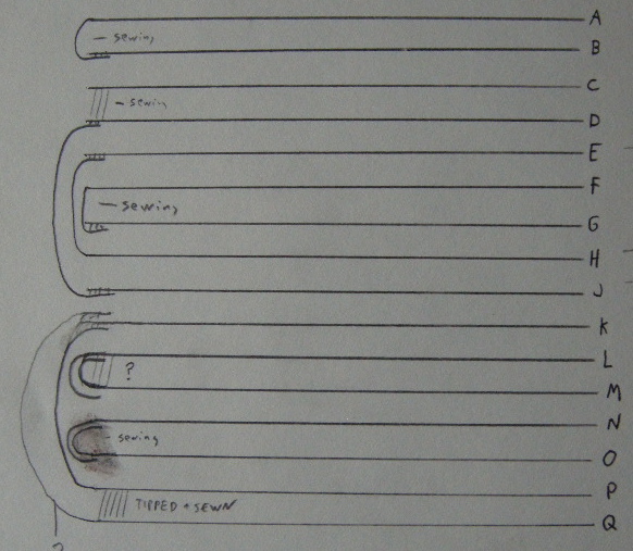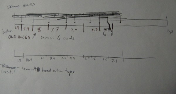 The sewing hold structure was fairly easy to record. Originally it was sewn through six single holes, likely raised cords. The rebinding was sewn on four broad cotton tapes. Below is a diagram of the two sewing hole patterns.