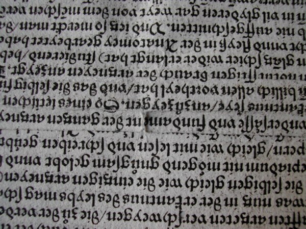 This photo shows a detail of the folded area after treatment. It was impossible to completely remove the fold, but there is an additional half line of text visible and a reader was able to decipher this, perhaps for the first time.