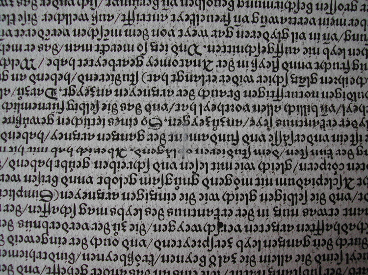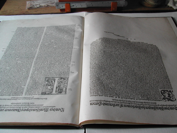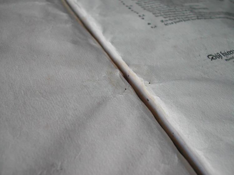 A crease like this has been noted in other copies of this book, and rare book librarian lore attributes it to the fact that this text was used by students, and they would fold it in half to carry it to and from school. In this case, however, the crease extended through the text area, but not in the margins outside it, which would suggest it was not folding that created it, but the combination of the paper being cross grain and the extreme pressure needed to print such a large surface area. The large size of these leaves also contributed to this. On a few of the leaves the crease was so severe that a line of text was obscured. The puckered area in the middle is the result of this horizontal page fold bending. Heavy pressing during the rebinding might have compressed these folds even further, expelling air and making them impossible to open without humidification.